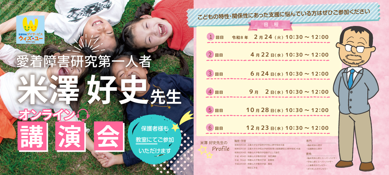 ウィズ・ユーの共同研究者で、愛着障害の第一人者でいらっしゃる和歌山大学教育学部教授の米澤好史先生の講演会を全6回にわたり開催いただきます。ウィズ・ユーにお子様が通われている保護者様、今後ウィズ・ユーの利用を検討されている […] -