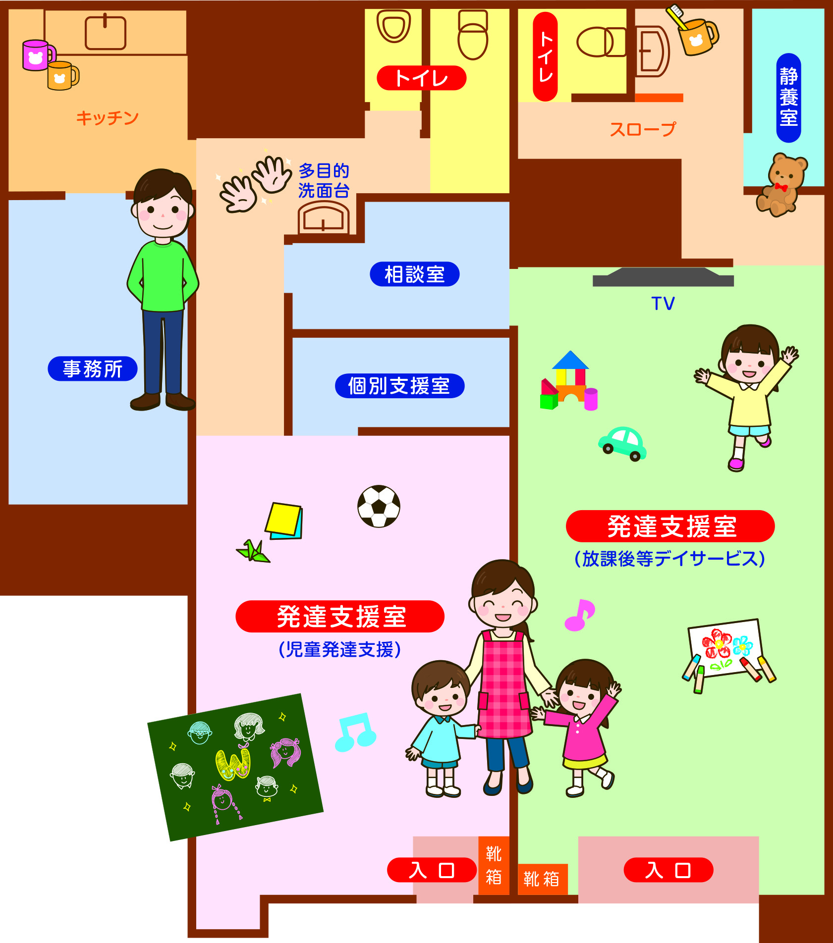 | 9:30 | コミュニケーションタイム 始まりの会 個別・集団支援 生活・運動支援 就学前支援全般 |