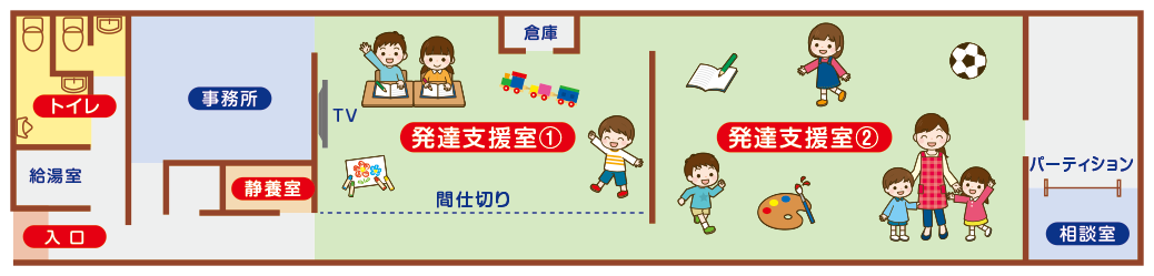 | サービス 提供時間 | ■児童発達支援 月~金 10:00~16:00 土曜日・祝日 10:00~16:00 ■放課後等デイサービス 平日 14:30~17:30 土曜日・祝日 10:00~16:00 |