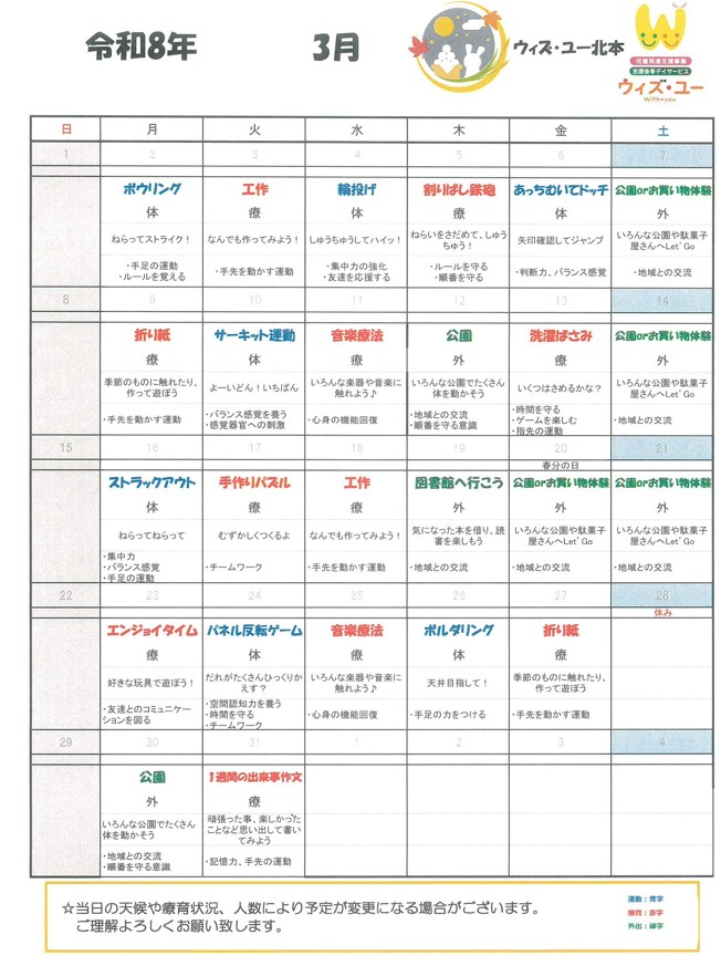 | 10:30 | 多彩な療育プログラム (外出イベント等) |